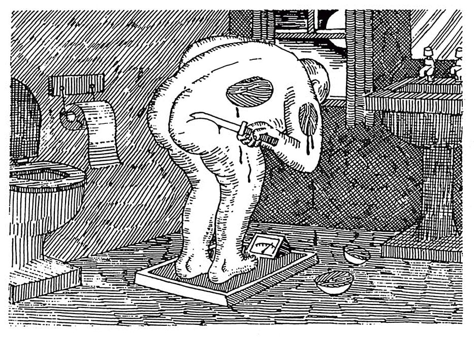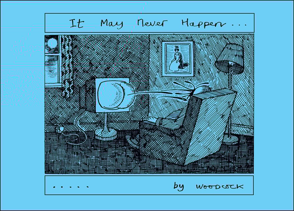 It May Never Happen collects the Kevin Woodcock cartoons that ran under that banner in Brain Damage and The Damage comic in 1989 and 1990. Long out of print and massively under-appreciated, the cartoons of Kevin Woodcock are an unnerving trip to a place that is just not quite right. In these glimpses of unease and weird cruelty the funny bone is always exposed and the widest grin belongs to a skull. Introduce yourself to one of the most distinctive voices in British cartooning.
